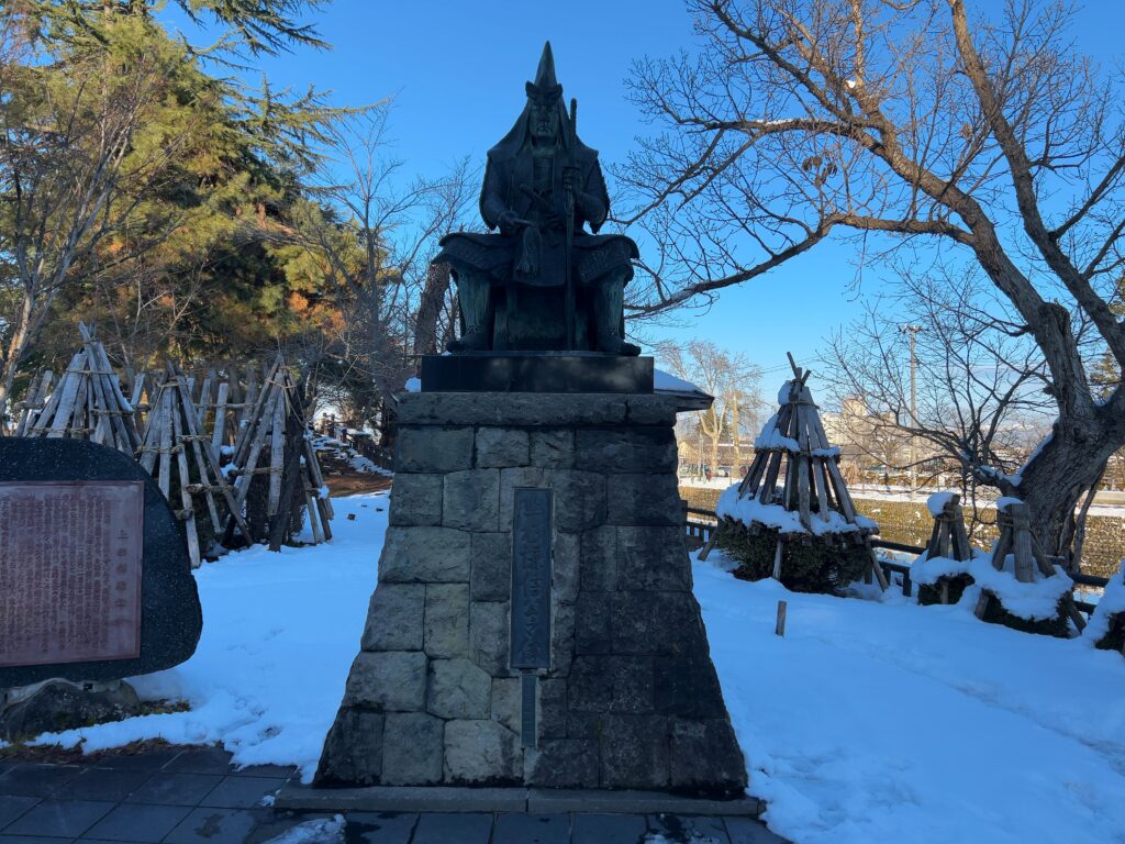 山形県米沢市の「上杉神社」に立つ謙信の銅像。その鋭い眼光は、現代のビジネスマンに「お前の仕事に『義』はあるか?」と問いかけているようです。
